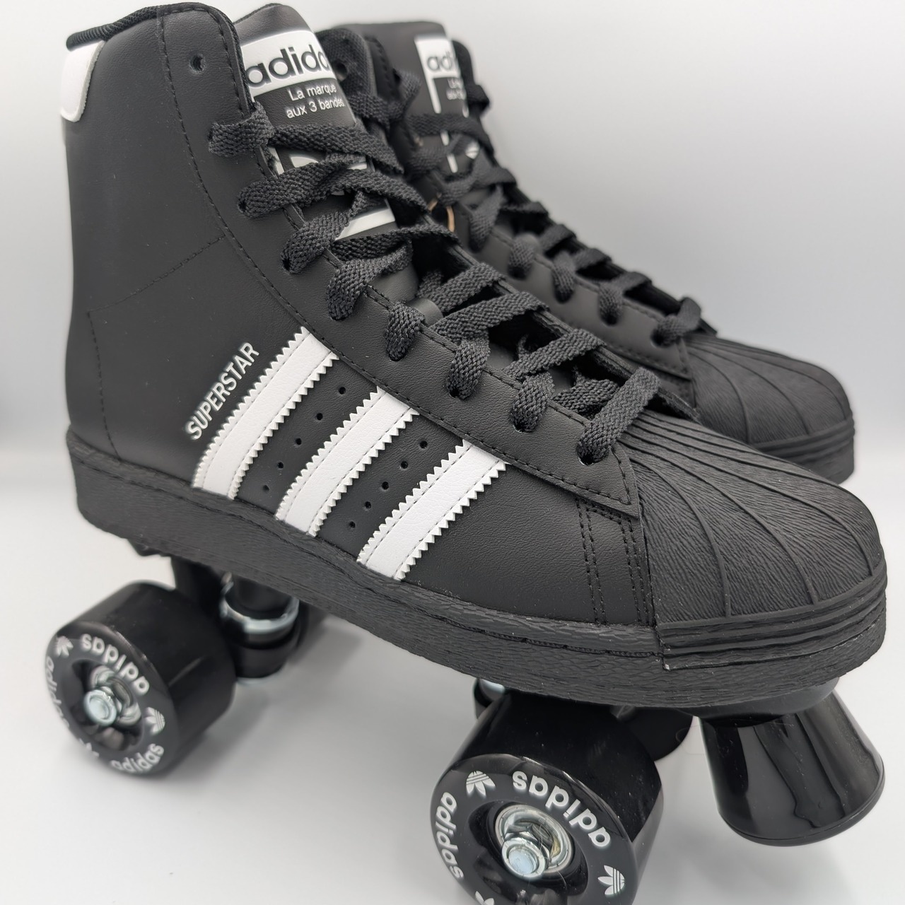 アッパーとソールはアディダスを代表するスニーカーの一つであるSuperStar(Pro Modelの方が近い?)そのもの。その伝統的なシルエットを残しつつ、アウトソールにがっつりとローラースケート用のトラックとウィールを装着しています。