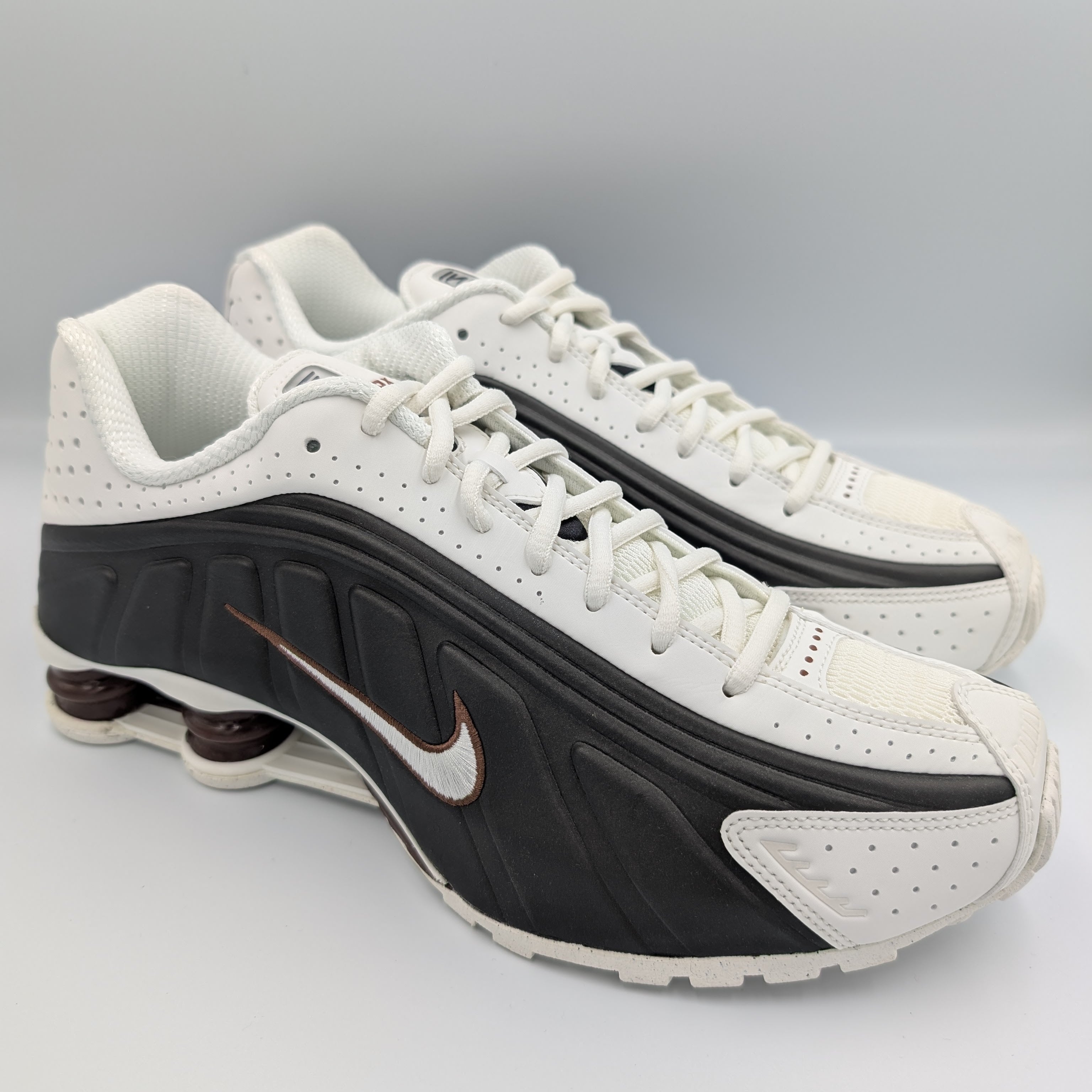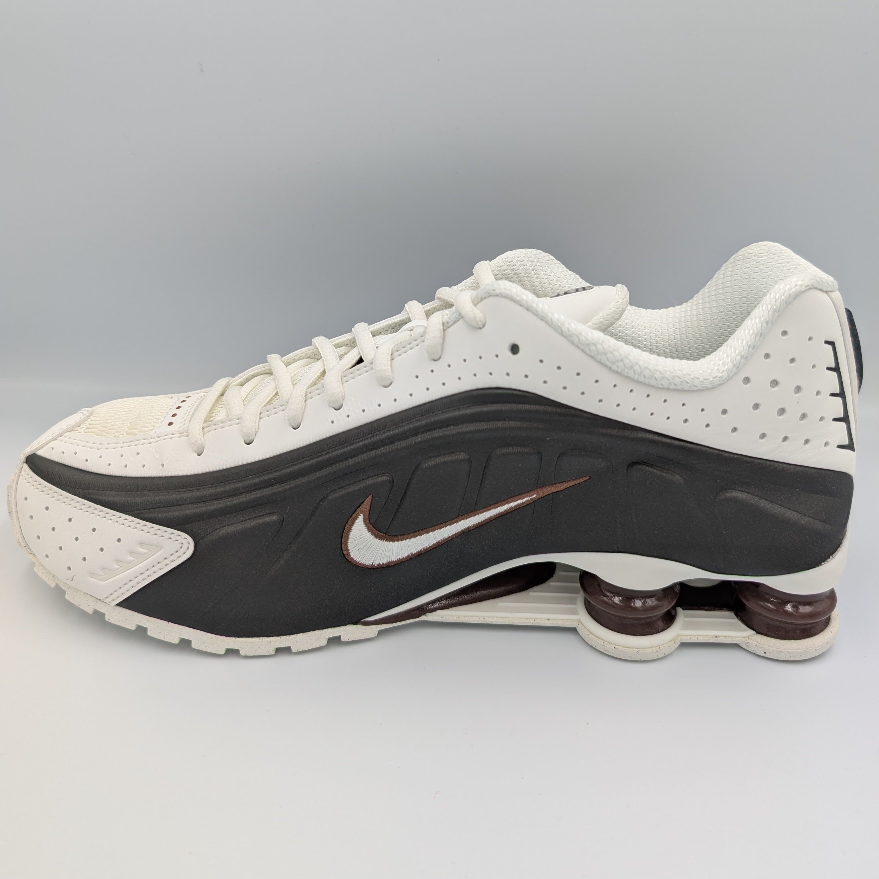 クリームがかった白と黒をベースに踵部のShoxのコラムと側面のナイキのロゴの縁取りにブラウンがアクセントとして入った本作。美しく、また洋服に合わせやすそうなカラーリングが入荷の決め手になりました。