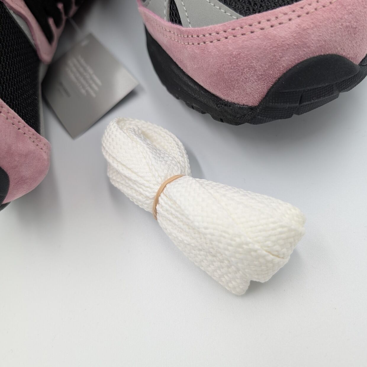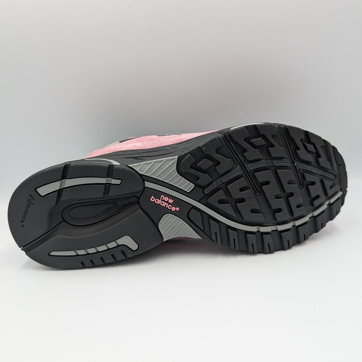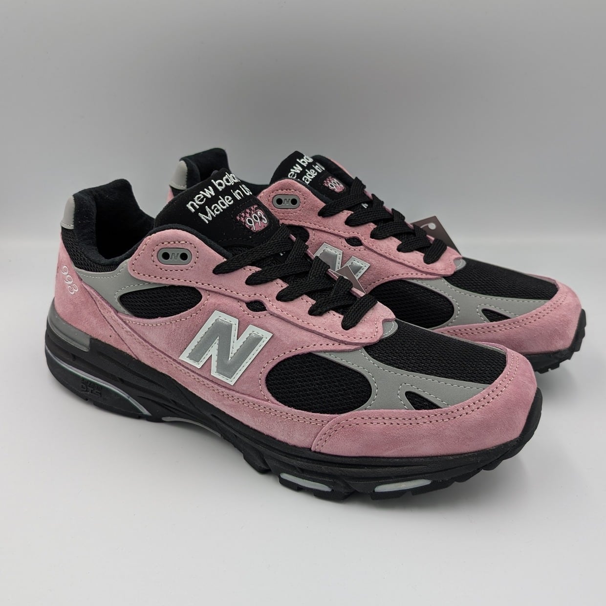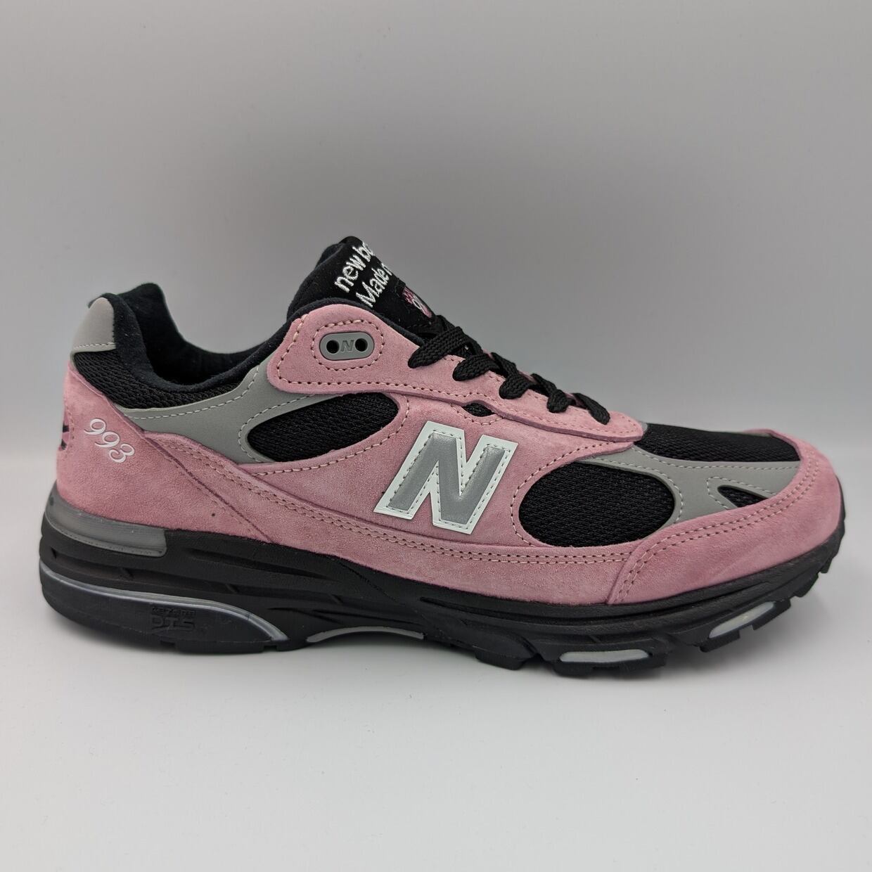 アッパーは上質なピンク色のピッグスエードのオーバーレイと通気性の良いメッシュを組み合わせ、快適さと耐久性を両立したアッパー構造となっています。993において、ベースとなるメッシュアッパーに黒が用いられたカラーリングはあまり流通しておらず、また、そのシックな色によってスエード部分のピンク色がより際立つ美しい配色になっています。