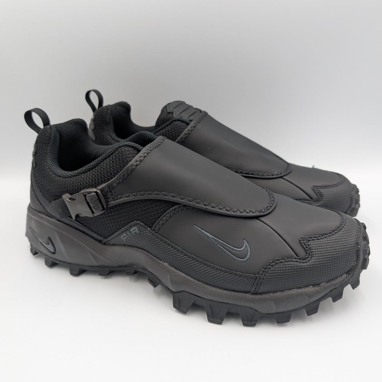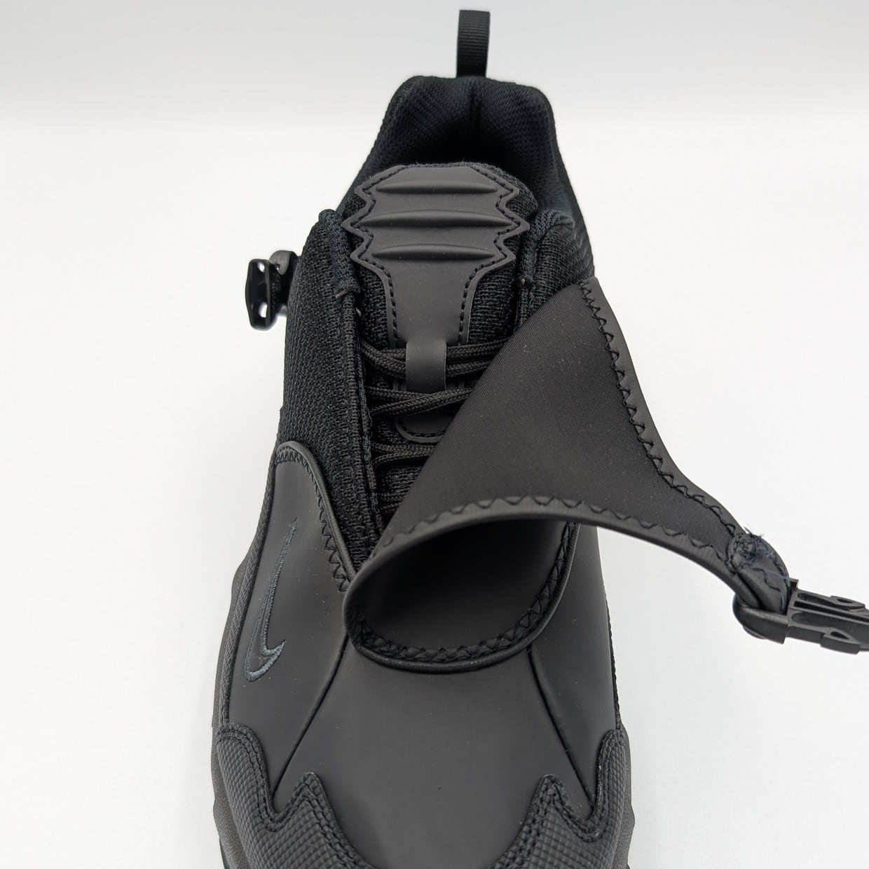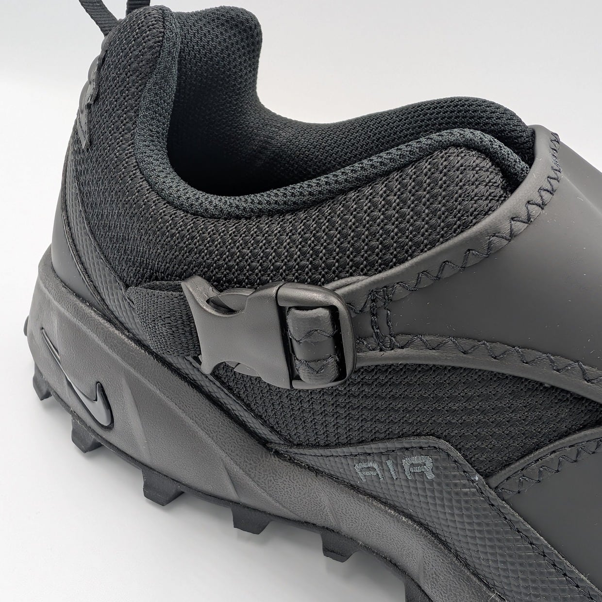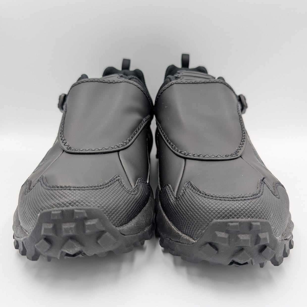 カラーリングは所謂 "Triple Black"。様々な種類の服装で履いていただきやすいのもポイントかと思います。マットな質感のアッパーと、複雑にレイヤードされたパネル構造が、単色でありながらも奥行きのある表情を生み出しています。